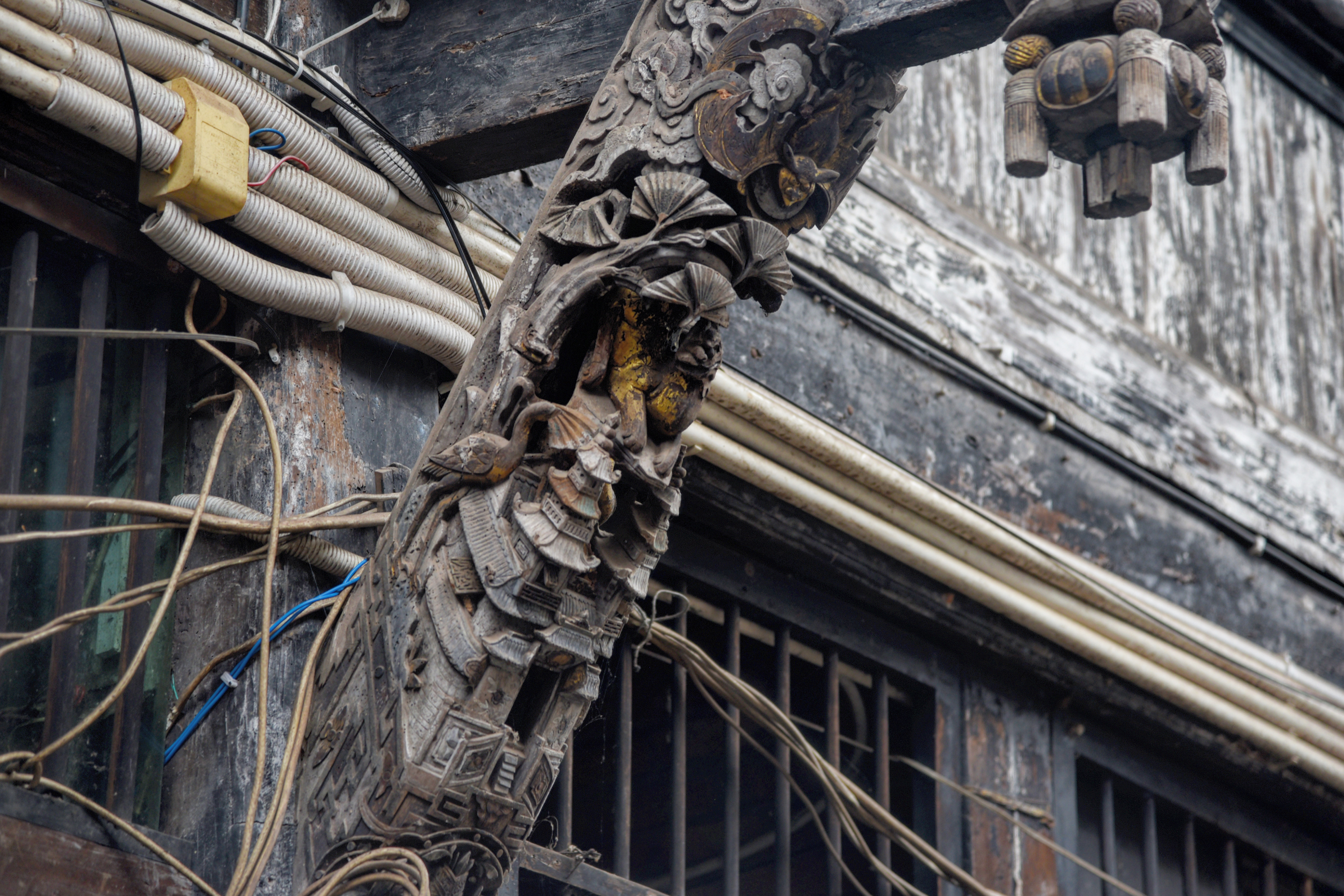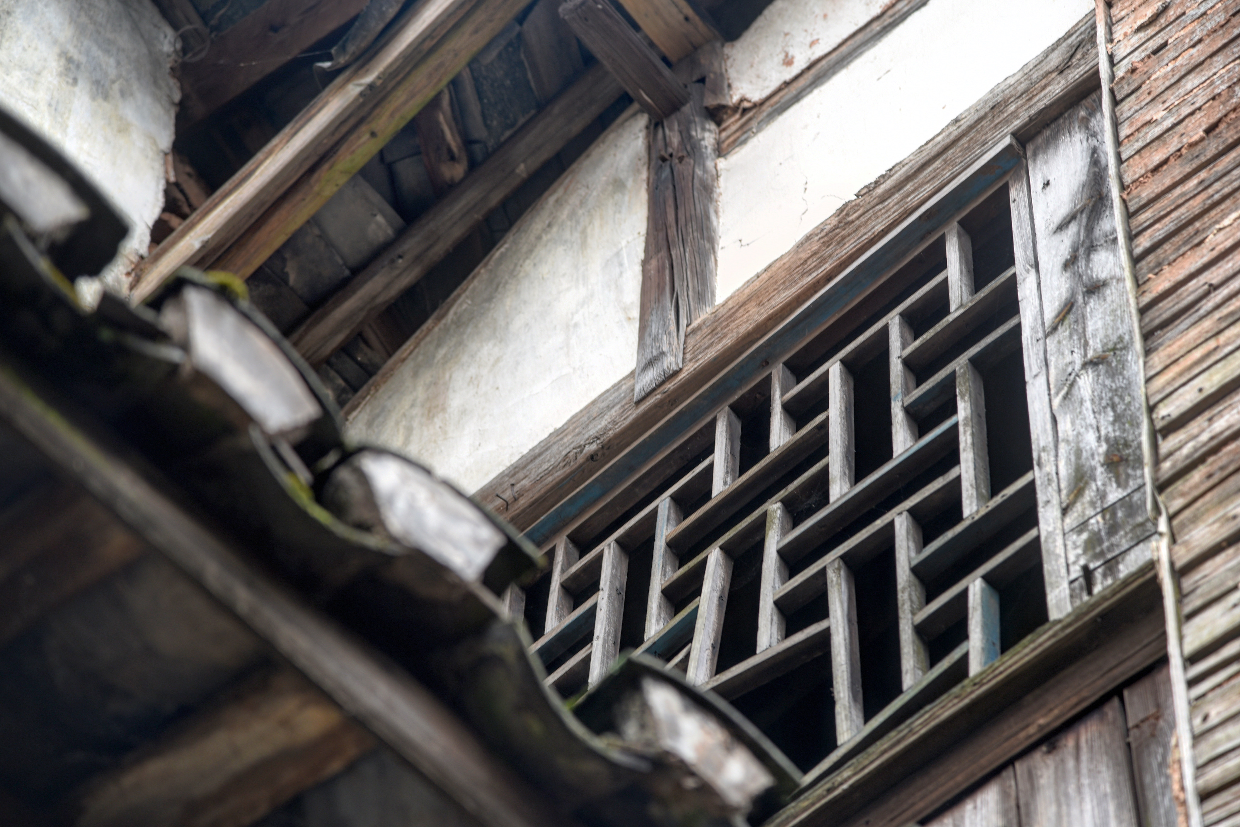 刚说了古镇里的建筑以明清时期为主,最大的特色就是在这些建筑上,镂空的窗户灰白的墙,无一不诉说着历史。要知道以前可是没有钢筋混凝土的,又不能像北方人一样直接挖窑洞,只能靠着泥土与木头,却也筑起了一排排的吊脚木楼,除了没有住人的屋子有点年久失修外,大部分建筑依旧坚挺,如果你仔细看的话,屋檐下的斗拱上还有很精美的雕饰,想必以前也是大户人家吧。