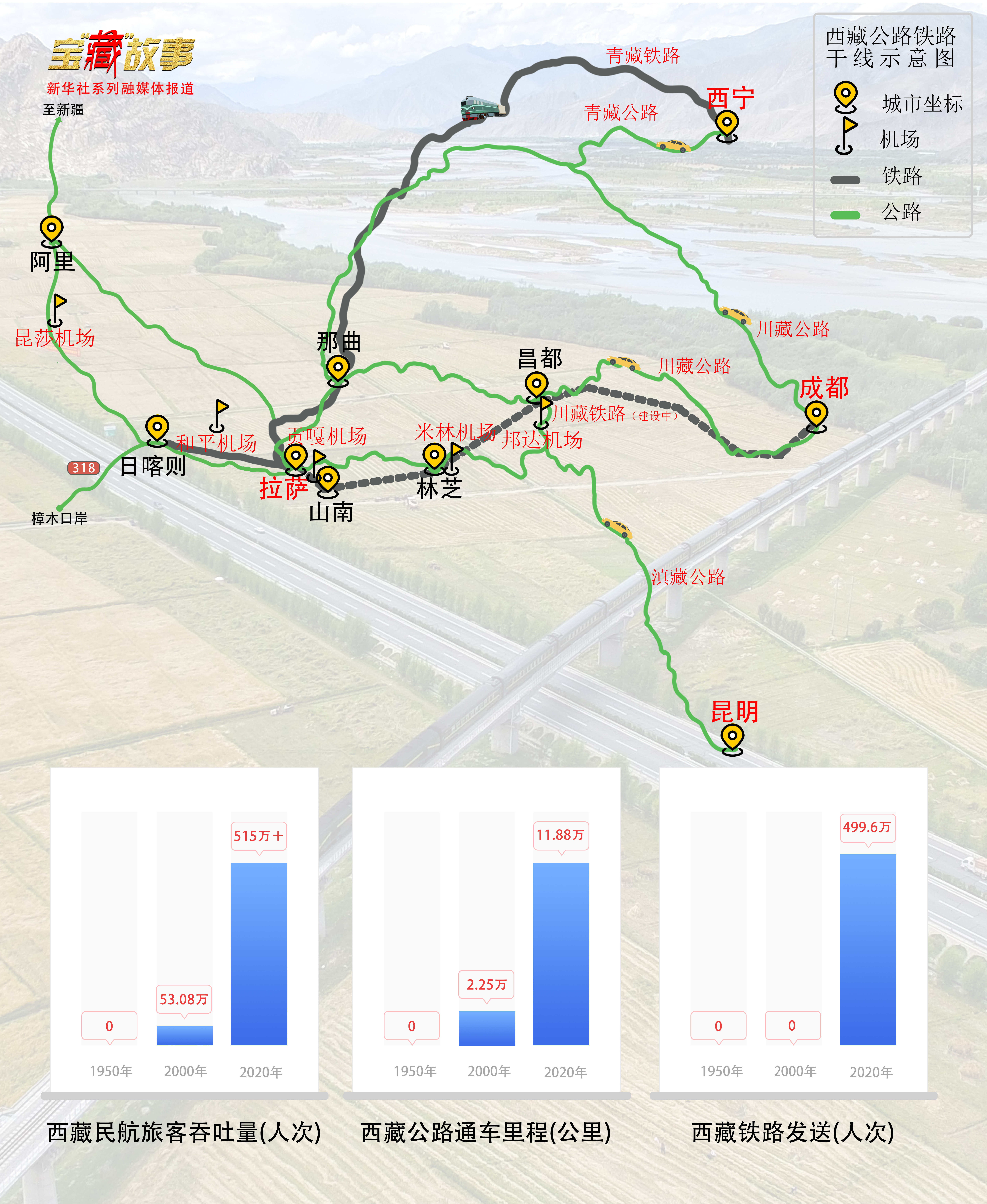 数据显示:2000年底,西藏公路通车里程仅有2.25万公里,而到2020年底,这一数字变为11.88万公里,乡镇、建制村通畅率达93.7%和75.9%,全区所有县(区)和476个乡镇、2050个建制村通了客车,民航旅客吞吐量从2000年的53万人次增至2020年的515万余人次。