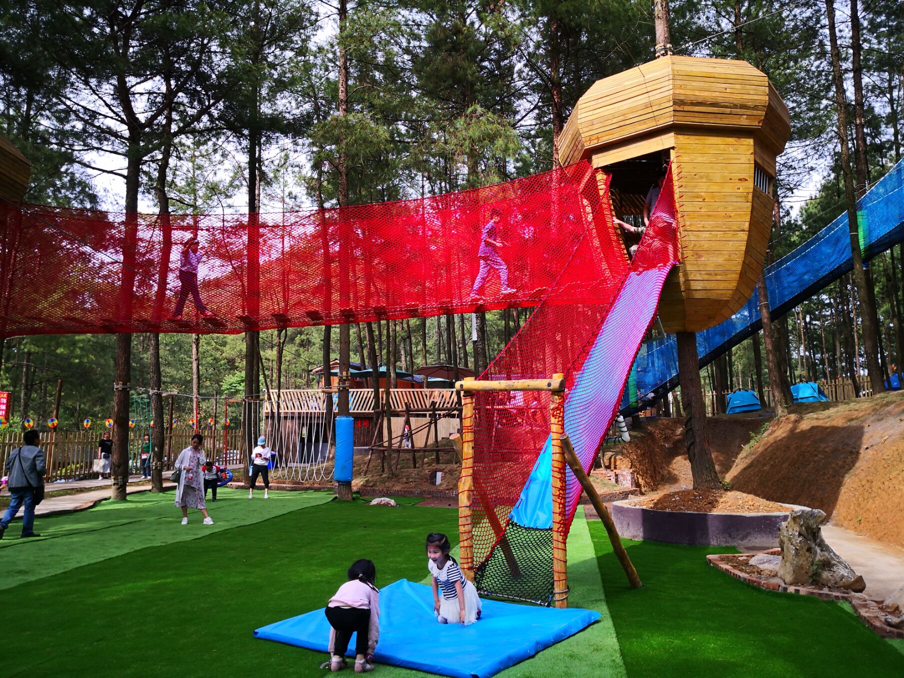 丛林部落,位于森林度假区,亲子游必打卡地方,打造有网红项目——丛林魔网,娱乐带娃两不误,小朋友在里面玩一天都没问题,在这里大人不仅可以围着喝茶,聊天,打牌,还有适用于小朋友释放天性的游乐设施,放松解压的大好选择,还可自主选择露营。