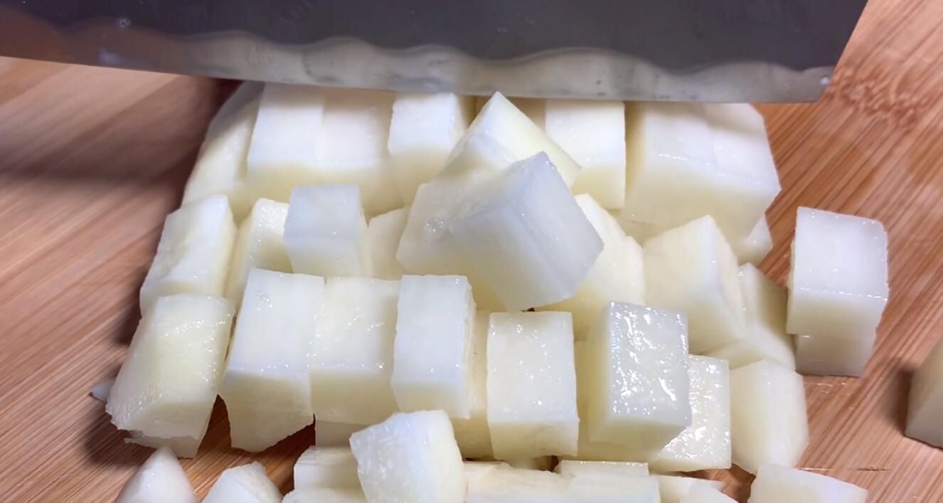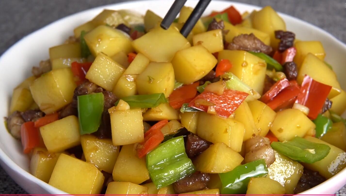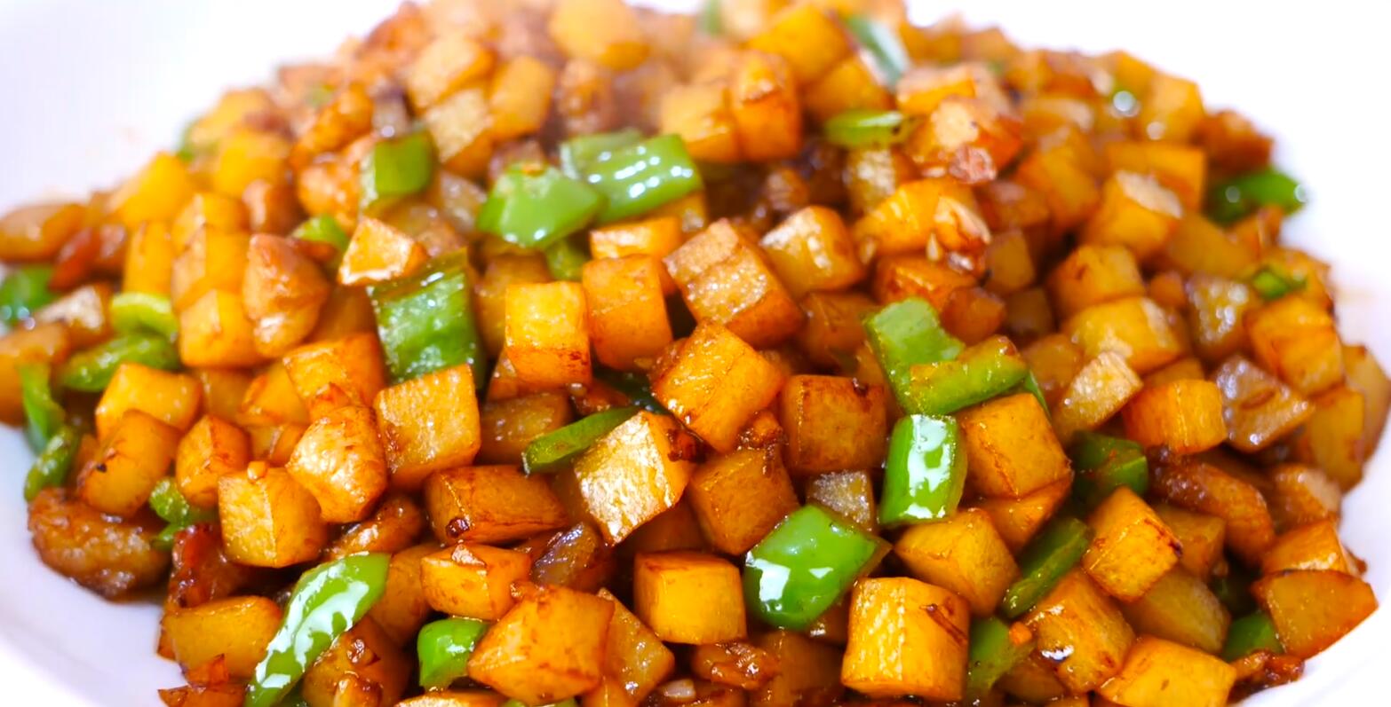 4、炒出香味后下入焯好水的土豆块,开中火不断翻炒,炒至土豆块断生后开始调味,加入适量食盐、鸡精、生抽、蚝油,快速翻炒均匀,使土豆充分吸收调料入味,最后撒上切好的青红椒块,开大火快速翻炒均匀,炒至青红椒断生后就可以关火出锅了,盛入盘中,这道非常美味的土豆丁就做好了,色香味俱全,特别下饭入味。
