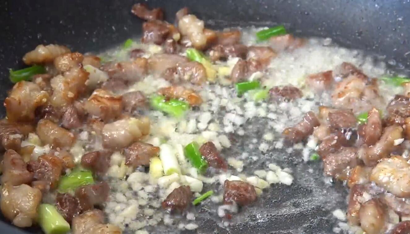 3、锅中倒入适量食用油,油热后下入切好的五花肉,开中小火不断翻炒将五花肉中多余的油脂煸炒出来,待五花肉炒至表皮略微焦黄的时候,下入切好的姜末、蒜末、葱段,继续开中小火不断翻炒爆出香味;