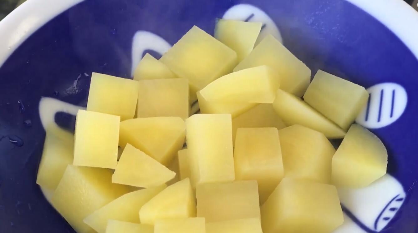 2、起锅,锅中倒入适量清水,开大火煮开后下入切好的土豆块,继续开大火煮1分钟左右,1分钟后将土豆块捞出,沥干水分备用;