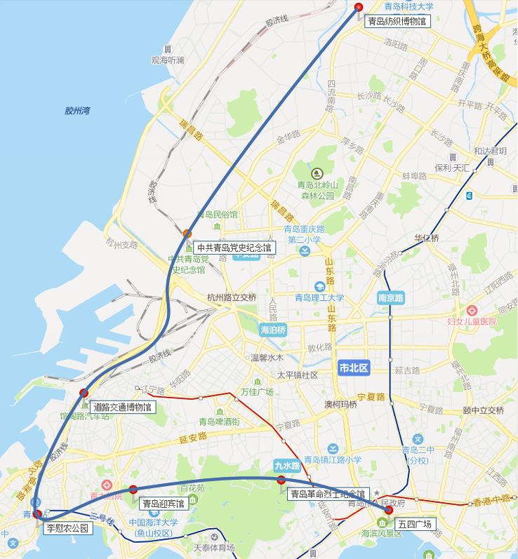 推荐线路:五四广场——青岛革命烈士纪念馆——青岛迎宾馆——李慰农公园——道路交通博物馆——中共青岛党史纪念馆——青岛纺织博物馆