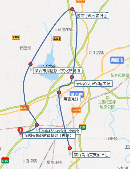 推荐线路:前保驾山党支部旧址——莱西党校(“莱西会议”专题展)——青岛双龙泉家庭农场(南京路上好八连组建地展馆)——胶东行政公署旧址——莱西市库区移民文化展览馆——大沽河岸绿道——青岛蟾公酒文化博物馆——花园头抗战教育基地(展馆)