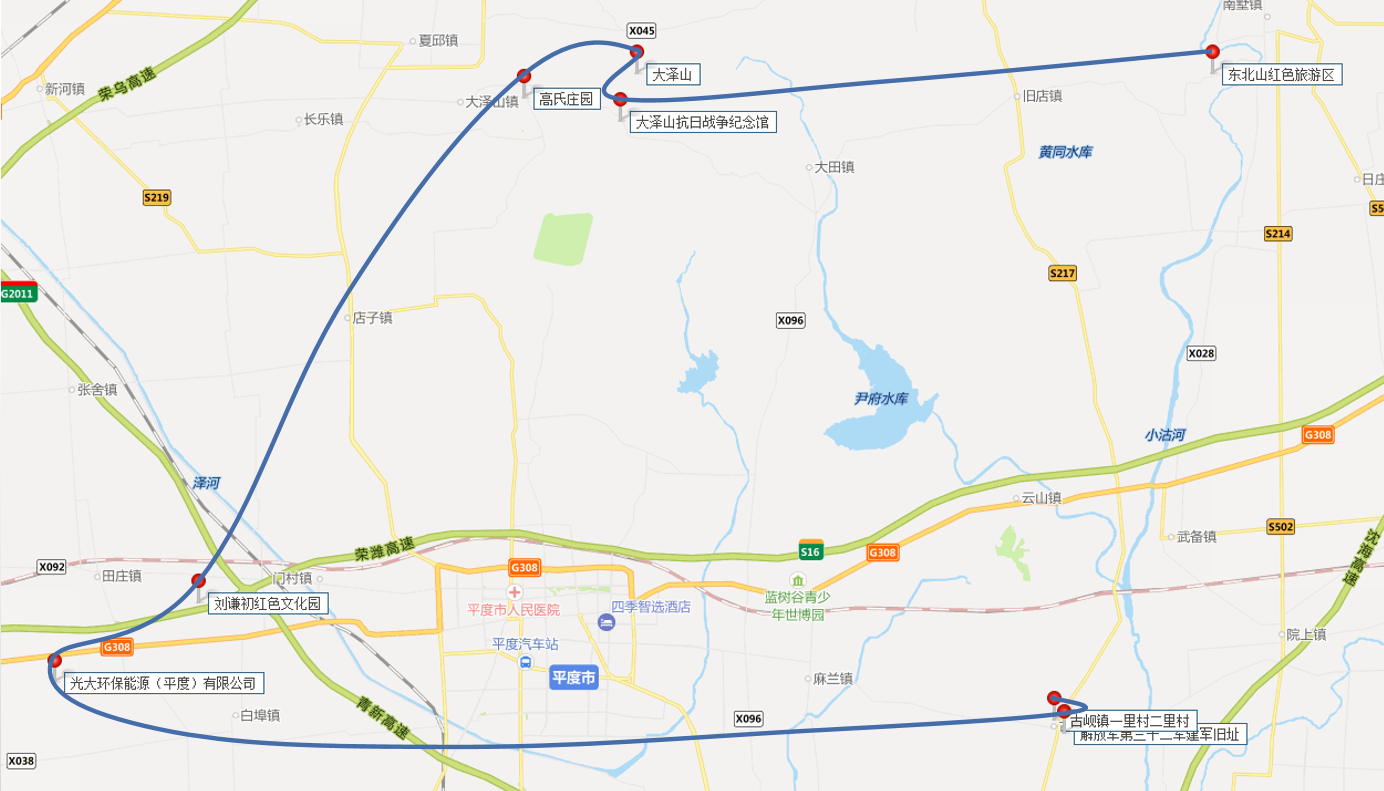 推荐线路:东北山红色旅游区——大泽山抗日战争纪念馆——大泽山——高氏庄园——刘谦初红色文化园——光大环保能源(平度)有限公司——中国人民解放军第三十二军建军旧址——古岘镇一里村二里村