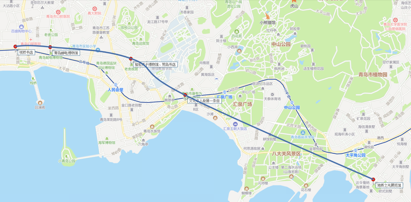 推荐线路:地质之光展览馆(八大关)——文化名人故居一条街——骆驼祥子博物馆——荒岛书店——青岛邮电博物馆——栈桥书店