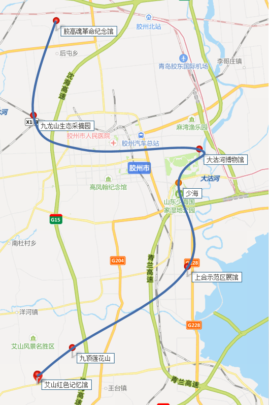 推荐线路:胶高魂革命纪念馆(玉皇庙村)——九龙山生态采摘园——大沽河博物馆(党史馆)——少海——上合示范区展馆——九顶莲花山——艾山红色记忆馆