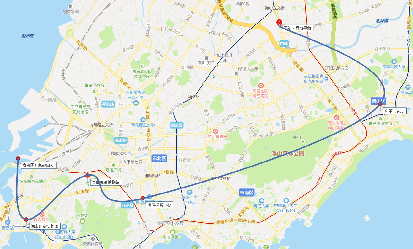 推荐线路:青岛国际邮轮母港——崂山矿泉博物馆——青岛啤酒博物馆——海信探索中心(世界电子消费博物馆和海信历史文化馆)——山东会客厅(青岛国际会展中心)——海尔卡奥斯平台