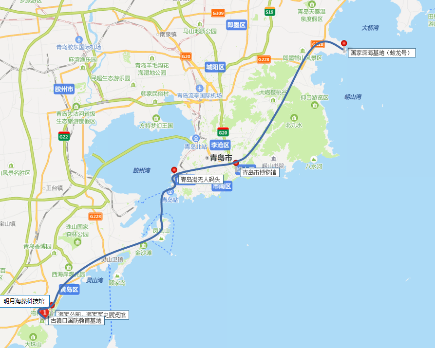 推荐线路:古镇口国防教育基地——明月海藻科技馆——海军公园——海军军史展览馆——青岛港无人码头——青岛市博物馆——国家深海基地(蛟龙号)