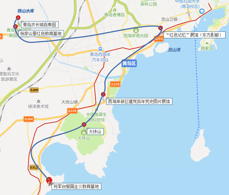 推荐线路:青岛齐长城百果园——杨家山里红色教育基地——“红色记忆”展馆(东方影都)——西海岸新区建党百年党史图片展馆(中铁·青岛世界博览城)——大珠山——将军台爱国主义教育基地