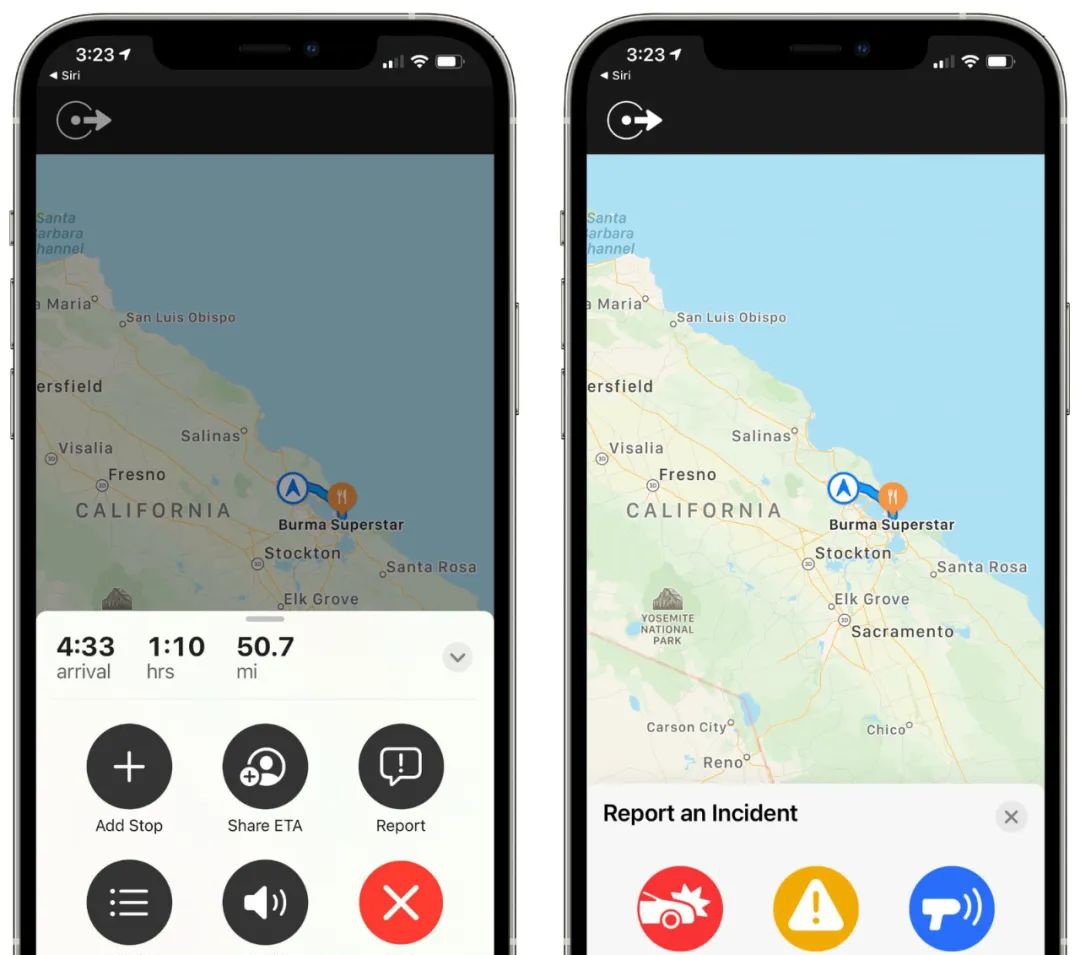 通过 iPhone 或 CarPlay 使用地图时,在 iOS 14.5 中可通过 Siri 来报告地面事故、危险路况和道路施工等问题,以提升地图的使用体验。地图中的预计到达时间 (ETA) 还新增了对骑行和步行的支持。
