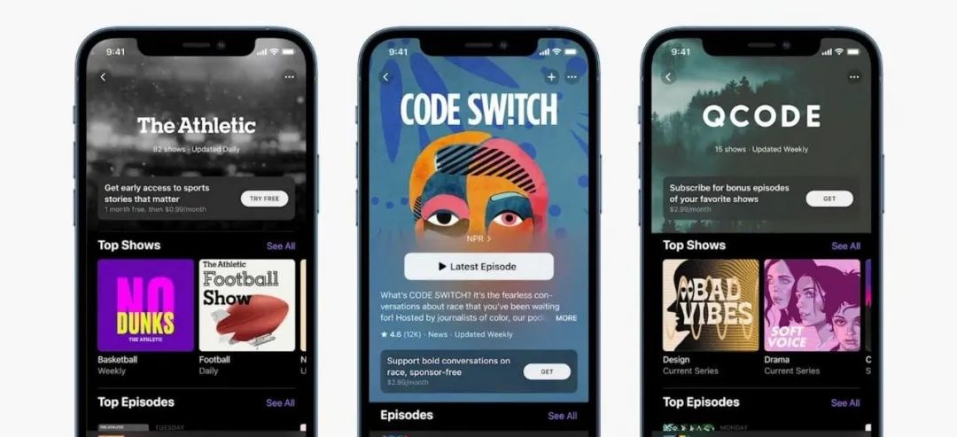 Podcasts App 的页面经过重新设计,并支持了许多新功能,如可直接下载单集并添加到资料库、下载和通知设置可按节目自定义、新增排行榜和搜索中的「热门类别」选项。