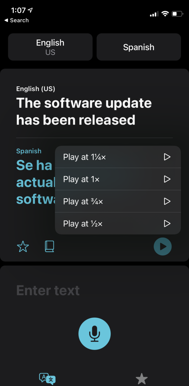 翻译新增了长按播放按钮可调整译文的播放速度选项。