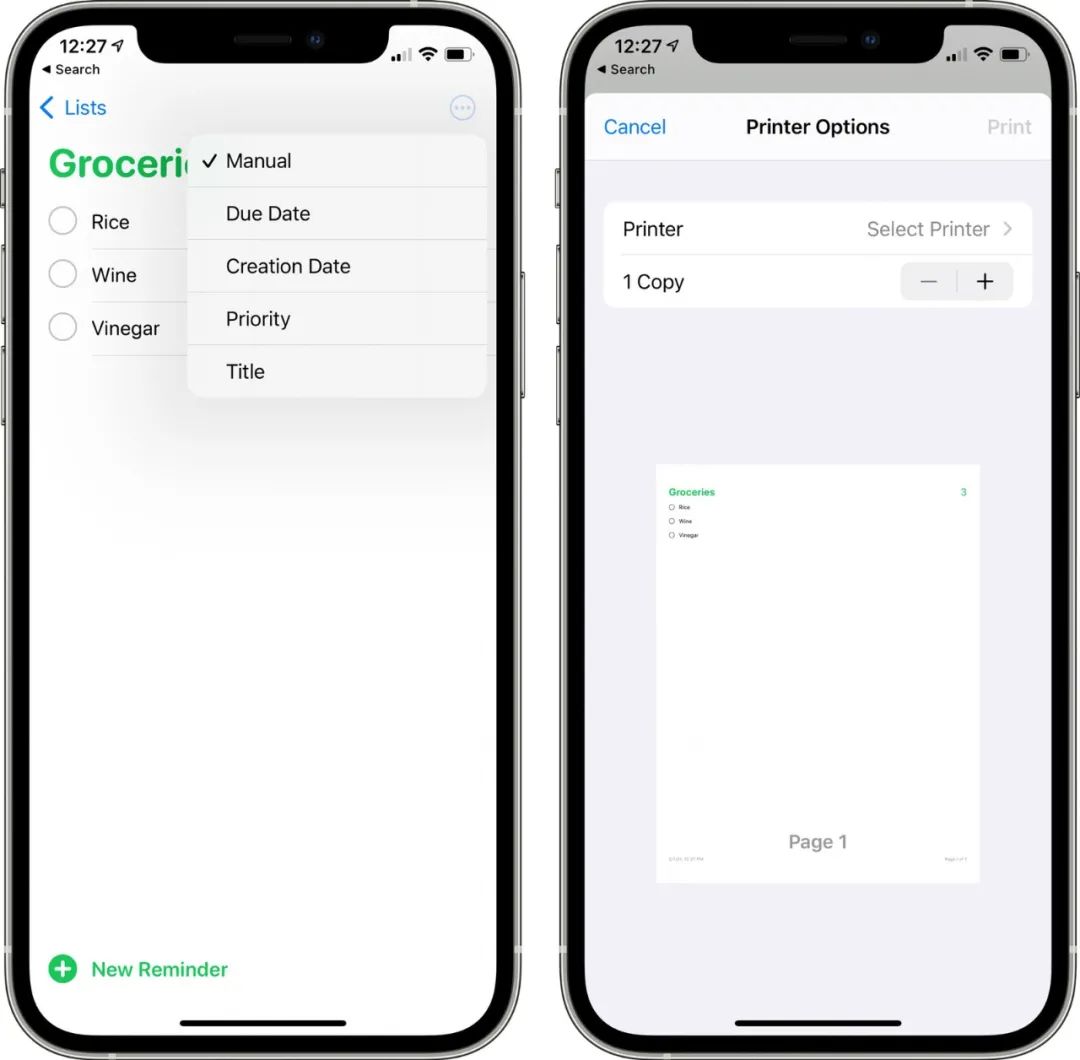 提醒事项新增部分排序选项,包括可按标题、优先级、截止日期、创建日期等排序,还新增了打印提醒事项的选项。