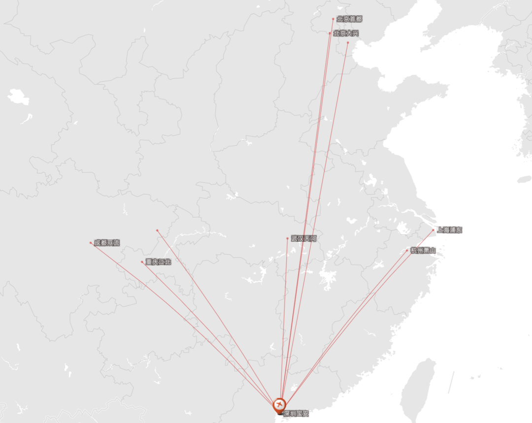 深圳的情况比广州更是好不到哪儿去,主要的目的地,北京、上海、杭州、成都、重庆、武汉、天津都有了,嗯别的都没了……