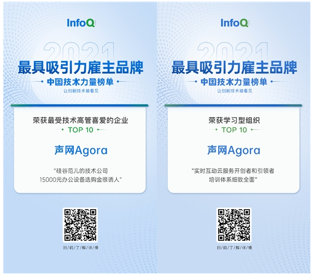 近日,由InfoQ发起并组织的2021中国技术力量之“最具吸引力雇主品牌”系列榜单结果正式揭晓。声网Agora成功斩获“最受技术高管喜爱的企业 TOP 10”、“学习型组织 TOP 10”两项大奖。与声网一同获奖的还有贝壳找房、字节跳动、得物APP、快手、PingCAP、腾讯等头部科技企业。