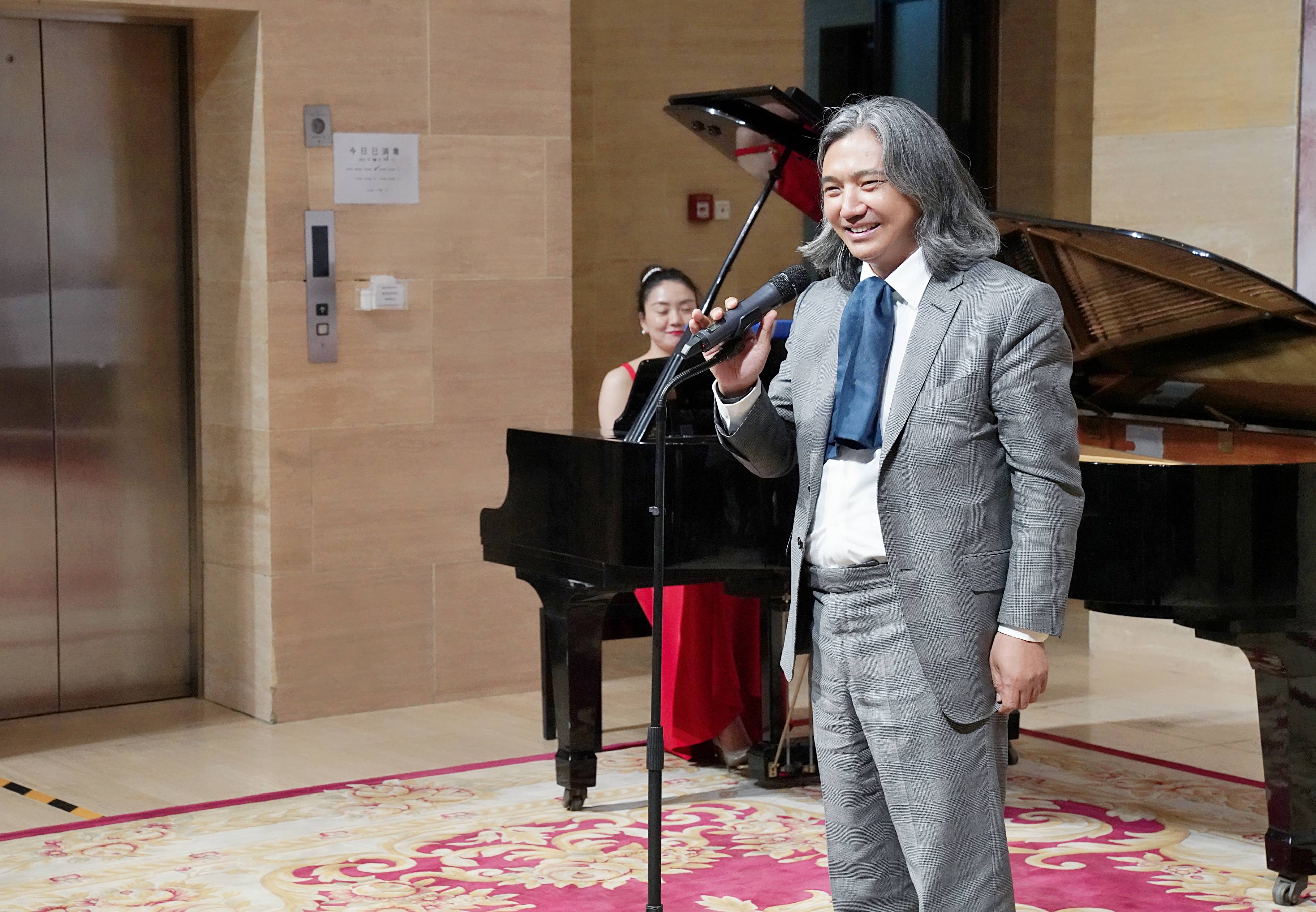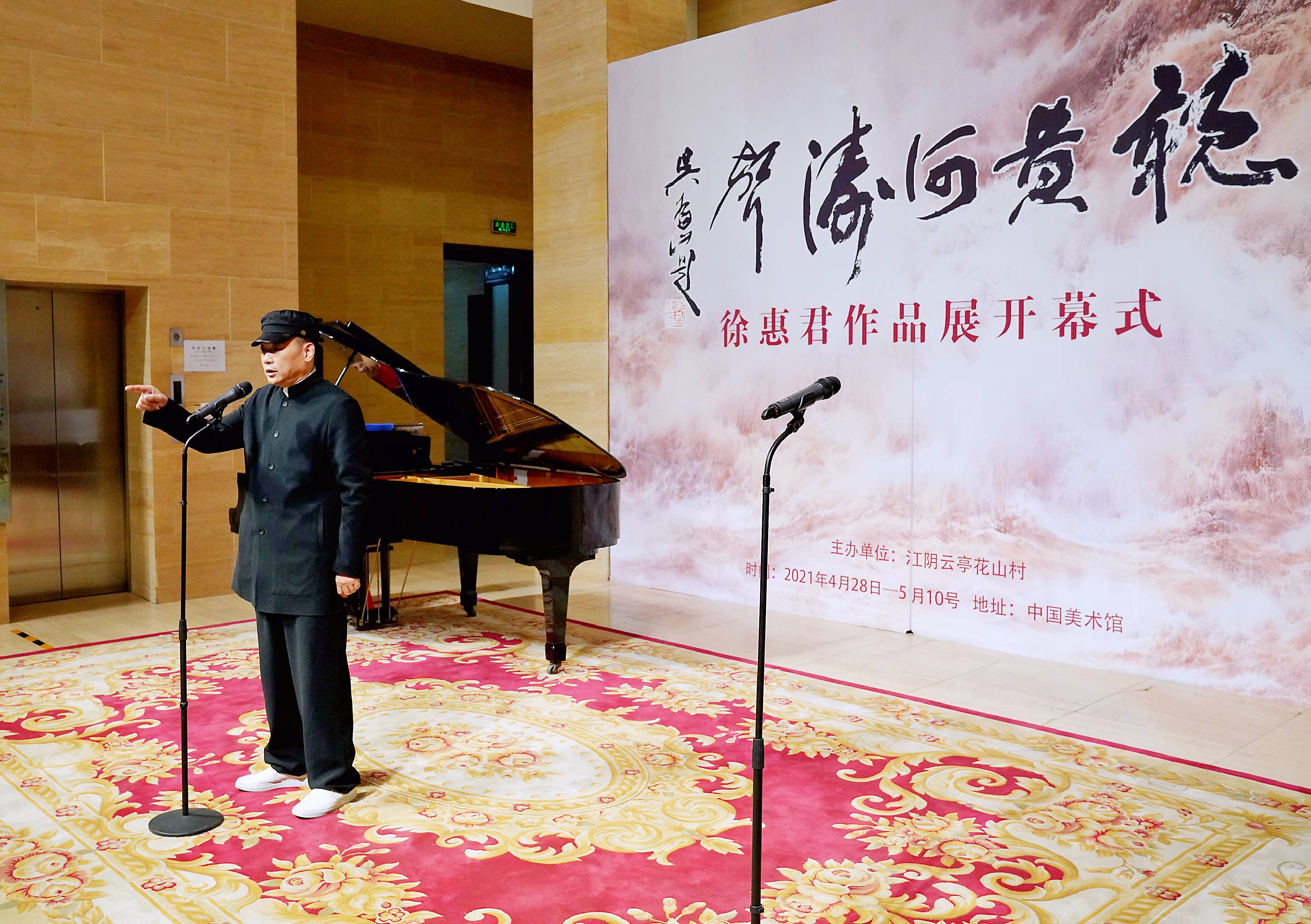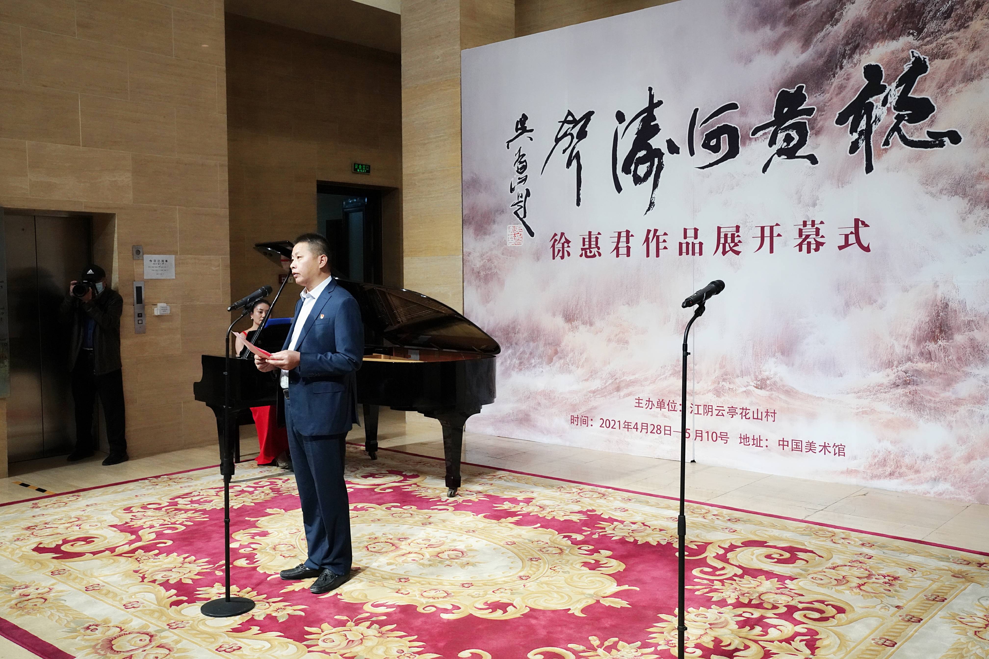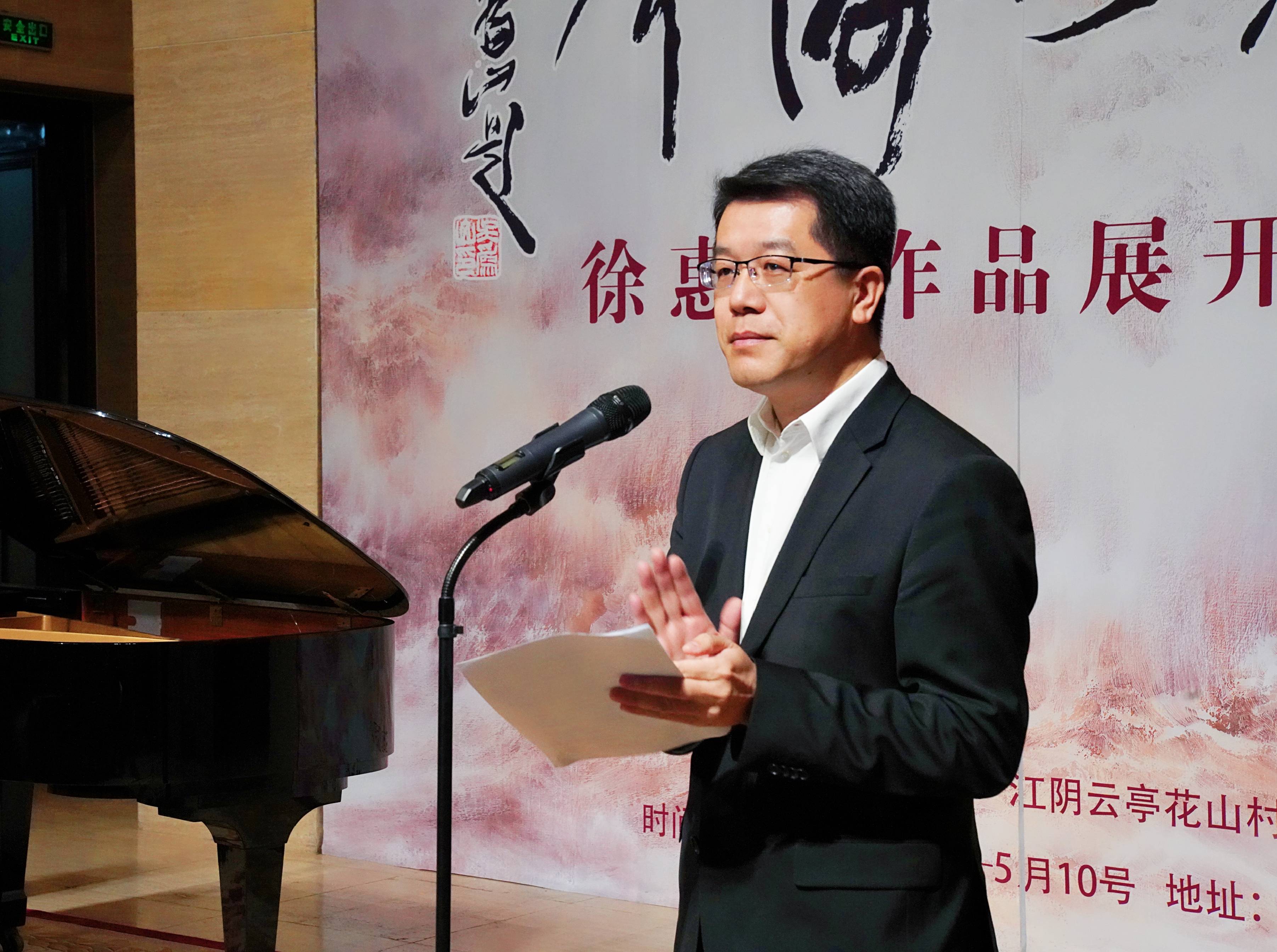画展主办单位江阴云亭花山村党委朱雪春书记致辞,他讲到,徐惠君是一位令人敬佩的艺术家,他的艺术来源于自然与感悟,将山河辽阔表现得淋漓尽致,为艺术铸造灵魂,用超然的艺术造诣,将大自然的美好绚烂点睛入画,以画载道抒发情怀。徐惠君笔下的黄河,拥有源源不断的能量,承载着中国人的信仰奔流不息奋勇向前,表达着他对黄河的热爱之情,怀揣对祖国繁荣发展的美好愿景。此外,预祝此次画展圆满成功,并祝徐惠君先生在艺术道路上取得更大成绩。