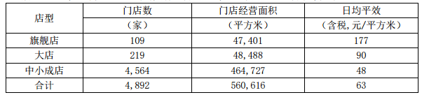 门店经营效率方面,年报显示,在4892家直营门店中,旗舰店达109家,日均坪效177元;大店共219家,日均坪效90元;中小成店共4564家,日均坪效48元。