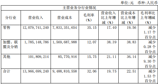 年报称,老百姓实现营业收入增长的主要原因是加盟业务增长以及零售业务老店同比增长及新开、收购等新增门店的贡献。