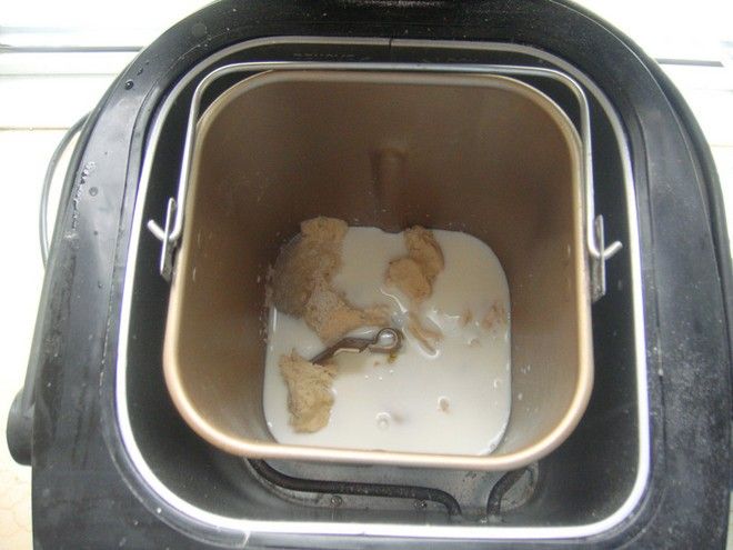2、面包桶先加入牛奶,鸡蛋,盐和白糖,老面撕后加入