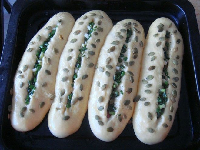 14、把拌好的香葱依次加入剪开的口子上面,喜欢瓜子仁的撒上一些南瓜子仁