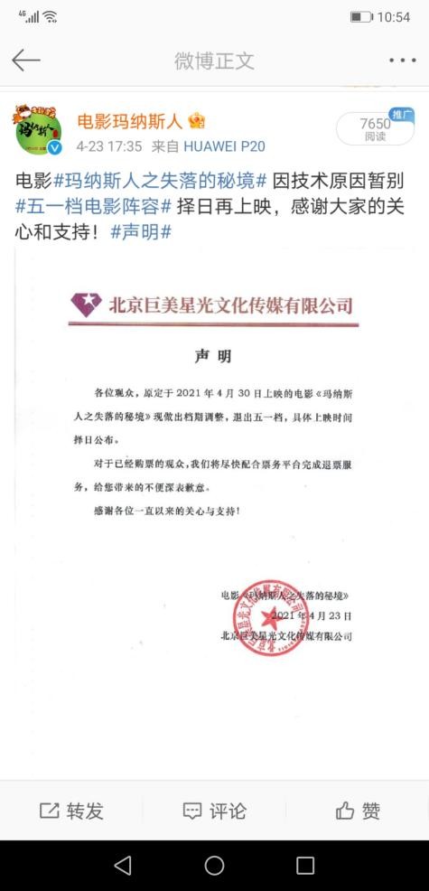 2021年4月23日,片方通过微博宣布电影《玛纳斯人》暂时撤档,理由是影片技术优化,从前面的预告片来看影片质量还不错的,看来改档后的《玛纳斯人》真是更值得期待!