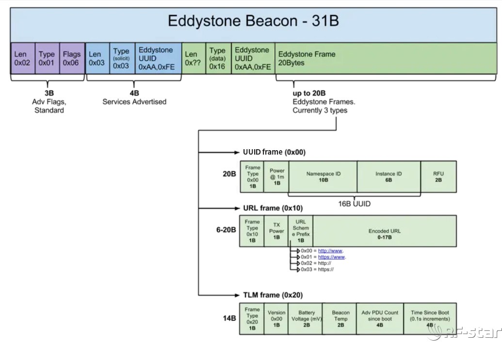而Eddystone多种框架包含UID、URL、TLM、EID四种格式数据。