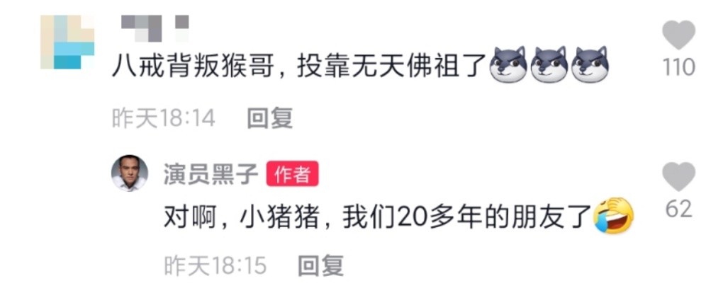 两人当年在同一部剧中分别饰演“无天”和“猪八戒”,有人还在评论区开玩笑,认为“八戒背叛猴哥,投靠无天了”。黑子当天心情也不错,回复该网友说自己和谢宁是20多年的朋友,还称呼谢宁为“小猪猪”,十分逗趣。