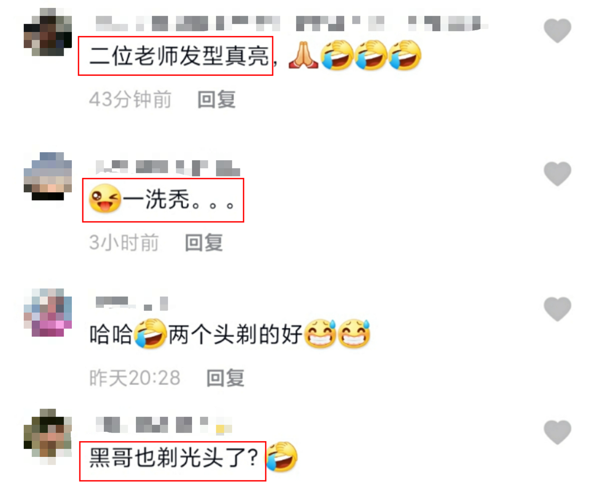 有意思的是,黑子和谢宁都是光头,两人的头在灯光照耀下反射着特别的光芒,让人想不注意都难。网友也忍不住感叹两位老师发型真亮,还有人调侃他们是一起秃了。
