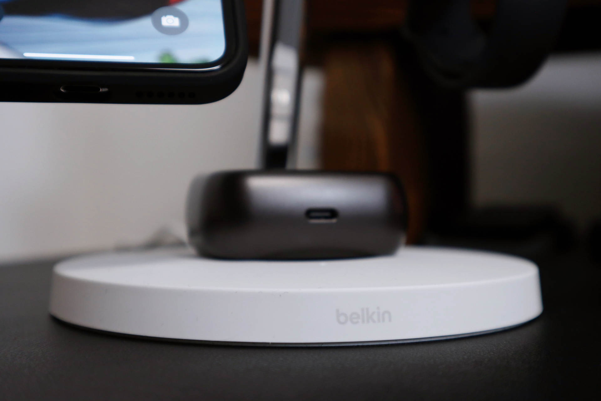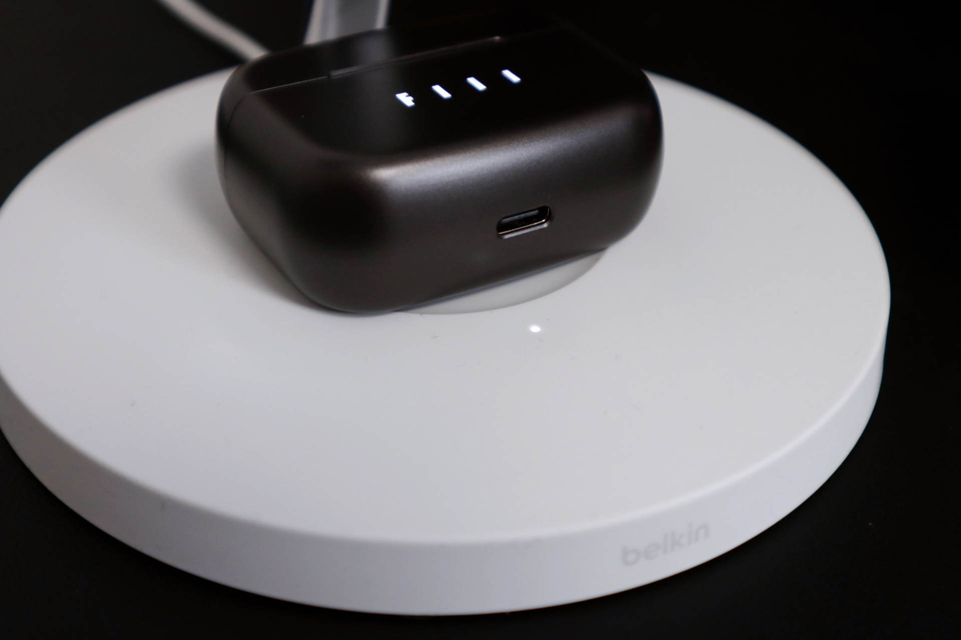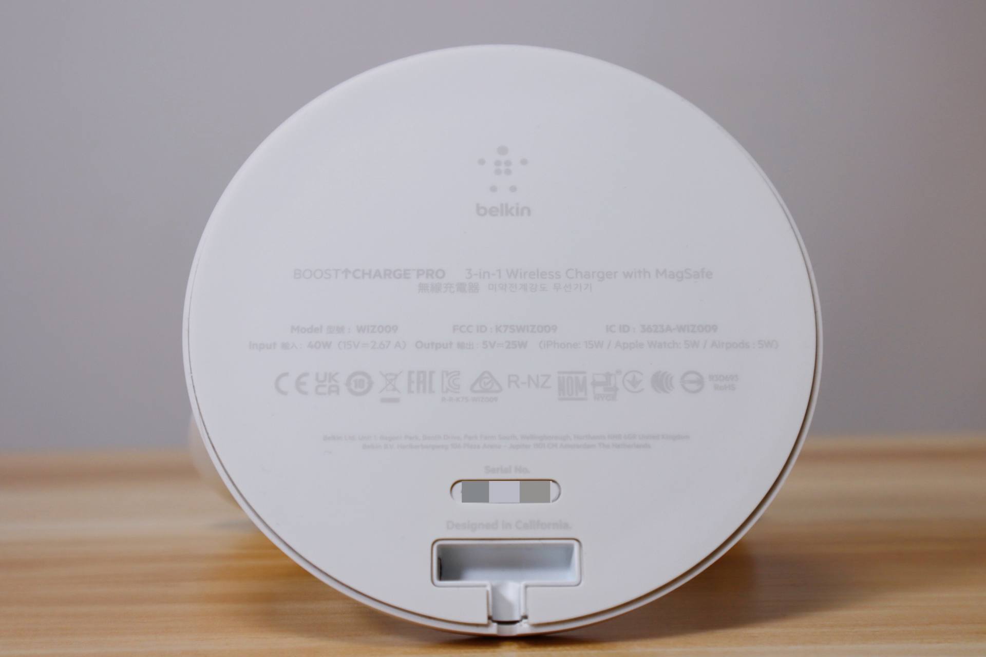除此之外,贝尔金三合一无线充在关于材质的选择上,也专门根据不同的设备进行着不同的选择。手机磁吸无线充与手表磁吸无线充的背面,均采用是曲面硬质的塑料壳,从背面看去就像是一大一小的两个车灯一般。