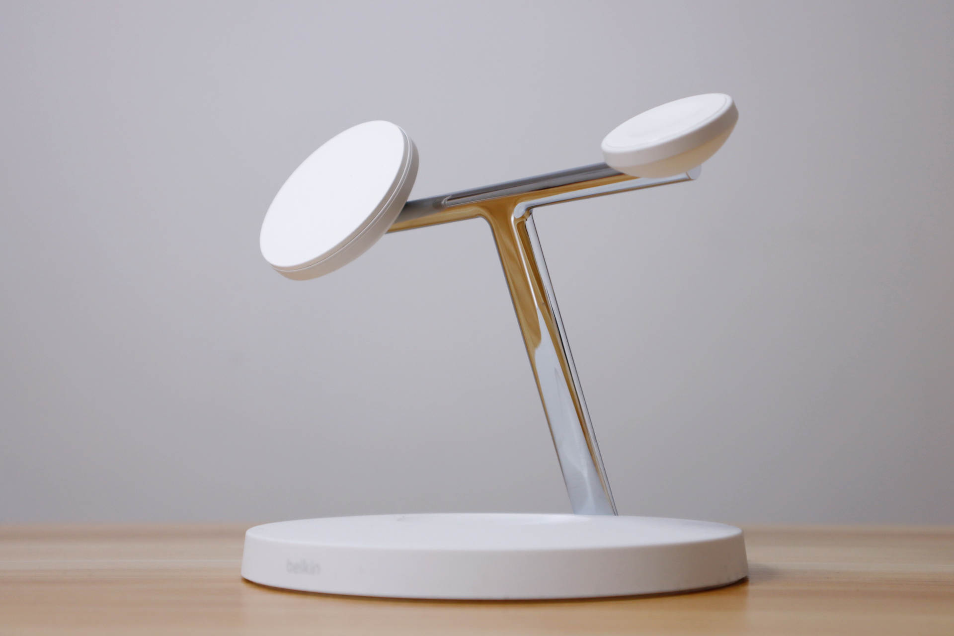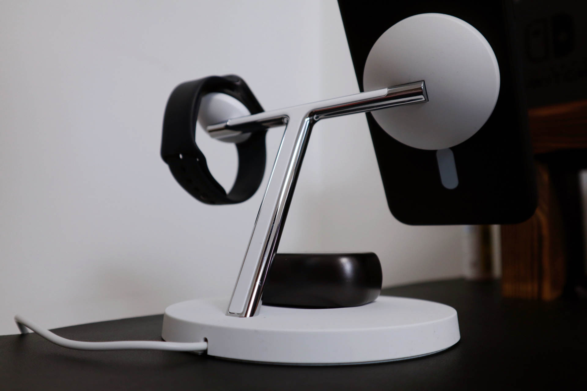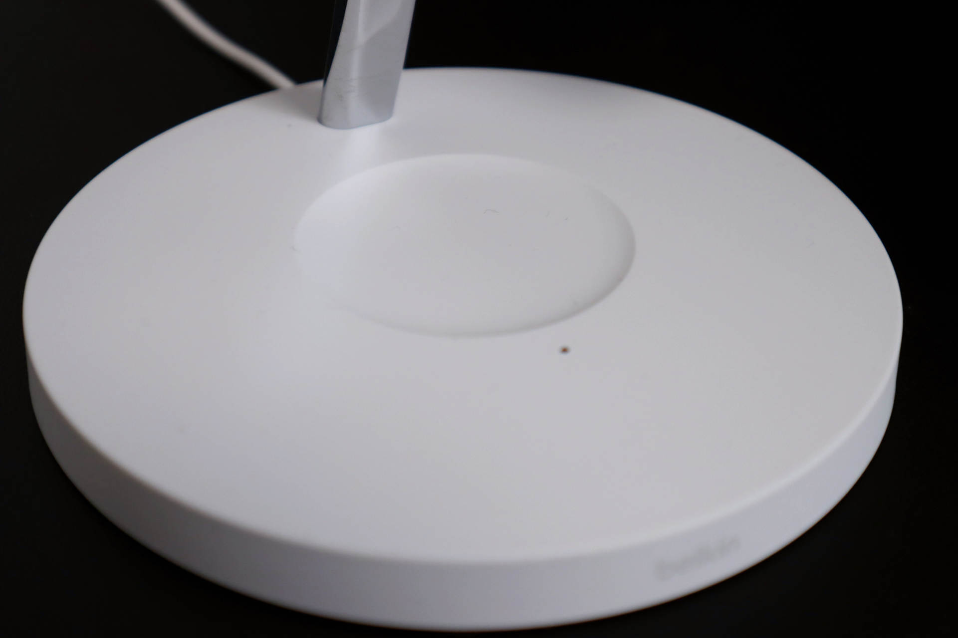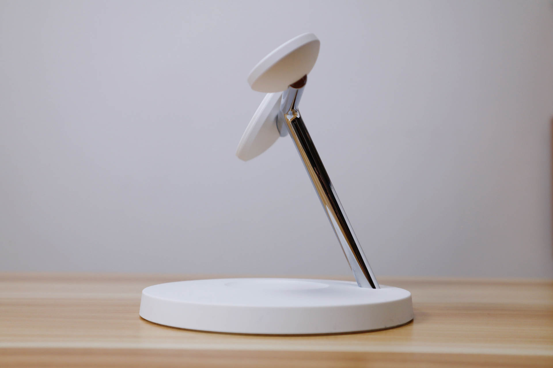 贝尔金三合一无线充整体可划分为底盘、支撑杆、手机磁吸无线充、手表磁吸无线充,共四个部分,并且专门根据不同位置的不同使用需求,增加着细节上的小设计,不仅方便着全家桶的充电,也让一边充电一边使用成为可能。