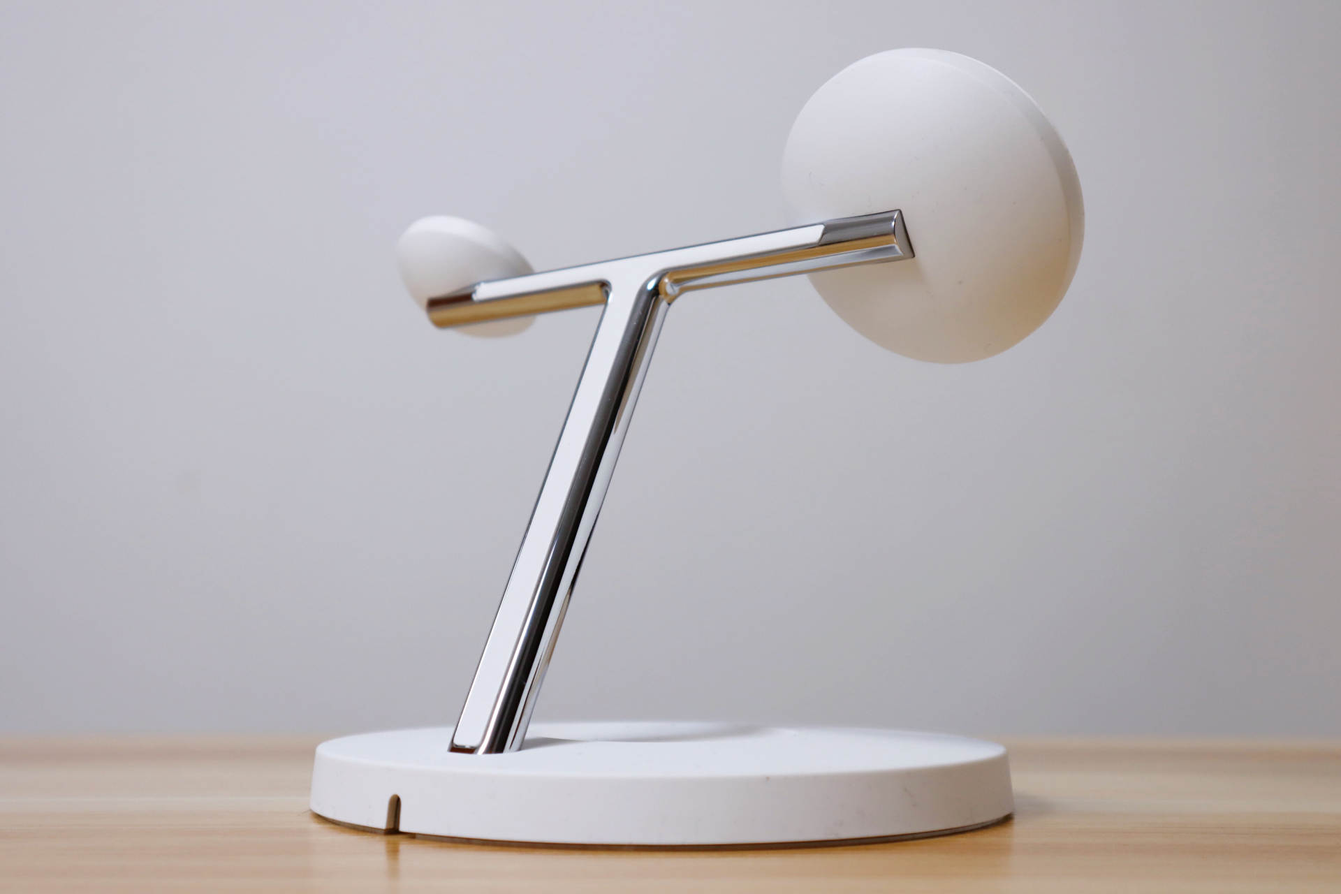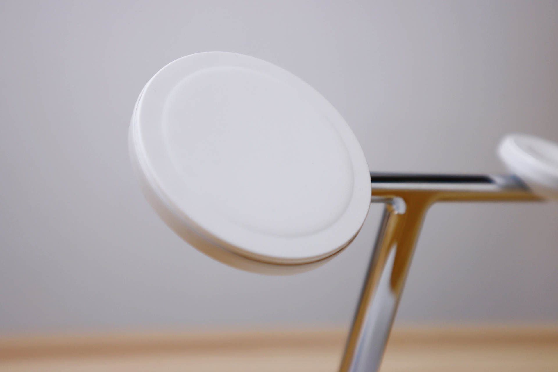 从侧面观察时你会发现支撑杆与手机/手表磁吸无线充之间,都有着不同的俯仰角度,以此来方便在充电的过程中进行使用。至于底盘中心的耳机无线充位置,还专门增加小凹槽的设计,让耳机盒在放上去时能够更加的稳固。再配合那颗LED充电指示灯,能够通过白、橙两种颜色,来提醒你的耳机是否已正确对准并开始充电。