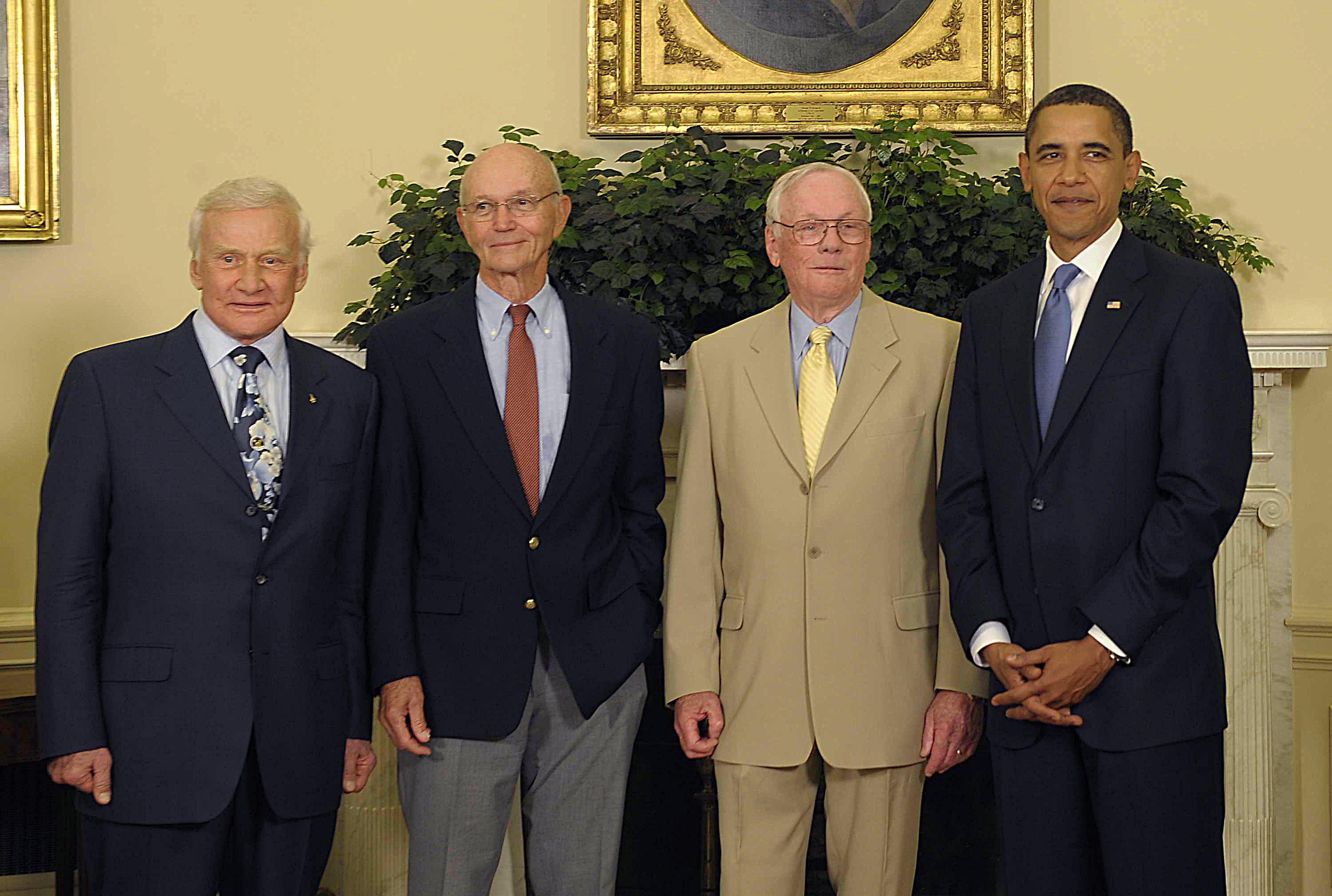 图为2009年7月20日,时任美国总统奥巴马在华盛顿白宫椭圆办公室接见“阿波罗11号”飞船的宇航员巴兹·奥尔德林、迈克尔·柯林斯以及尼尔·阿姆斯特朗(左一至左三)。(新华社记者张岩摄)