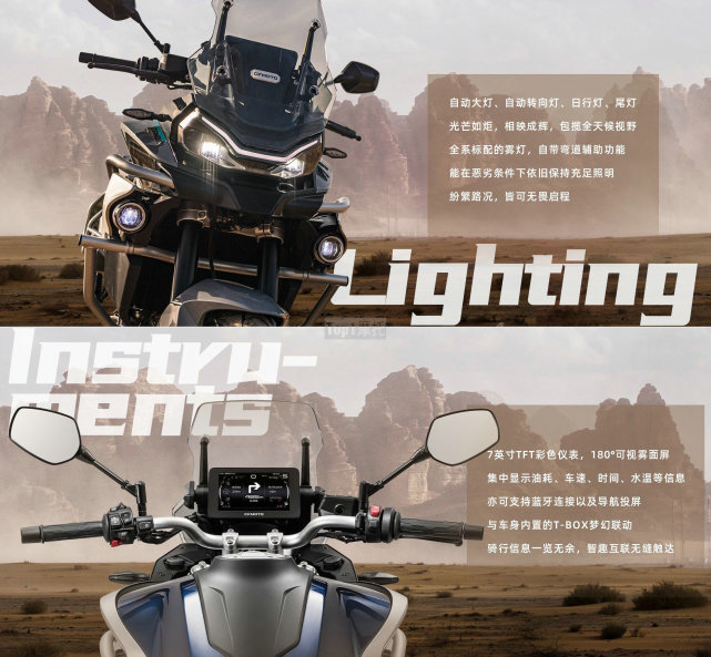 春风800MT和700CL-X一样配备了自动头灯,除此之外还有自动转向灯,全车灯源均为LED形式,全系标配雾灯,且雾灯具备弯道辅助功能。7英寸TFT仪表具有180度的可视视角,除了显示一些必备信息之外,还支持蓝牙功能和导航投屏,春风标配的X-BOX功能也在。