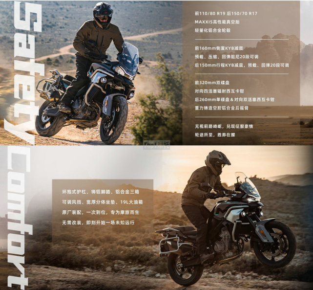 标准版轮胎也是前19英寸后17英寸的规格,搭配MAXXIS高性能轮胎,配备铝合金轮圈,避震方面前后均有KYB提供,前160mm行程倒立式前叉,预载、压缩、回弹阻尼20段调节,后150mm行程中置单枪避震,预载、回弹20段调节。刹车方面由西互提供,前320mm双盘+对向四活塞辐射卡钳,后260mm单盘+对向双活塞卡钳,后摇臂采用空腔式铝合金结构,原厂配备护杠和可调节风挡,油箱容量19L。