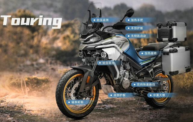 Touring(旅行版)才是长途摩旅利器,800MT旅行版在运动版的基础上,加入了更多适合长途和野外骑行的配置,比如:手部护板、座椅加热、手把加热、条幅轮圈、胎压监测、底部护板、大撑、转向阻尼器和双向快速换挡。