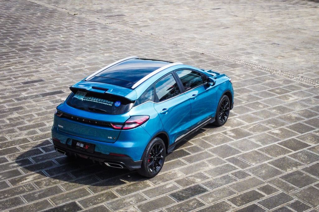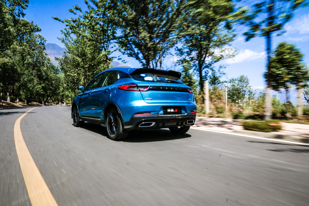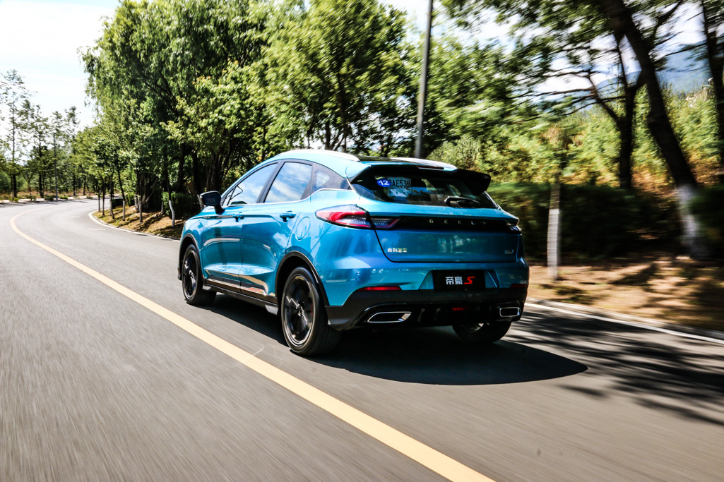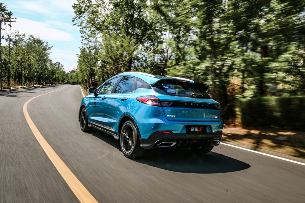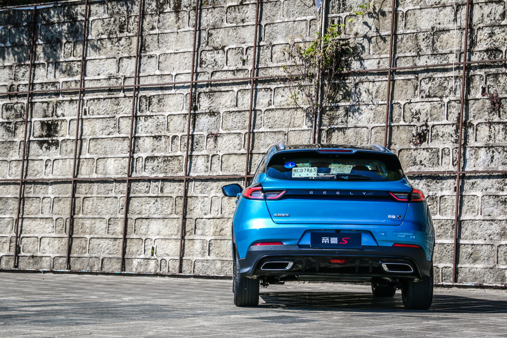 一条配有GEELY Logo的黑色装饰板将两个尾灯连接在一起,让尾部上下层次感分明,而且视觉重心更为高挑。看似双边双出的排气管实则为镀铬装饰件,并没有和排气管相连,这有些遗憾。
