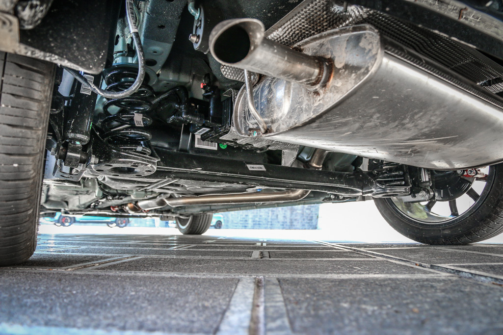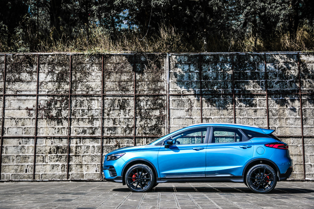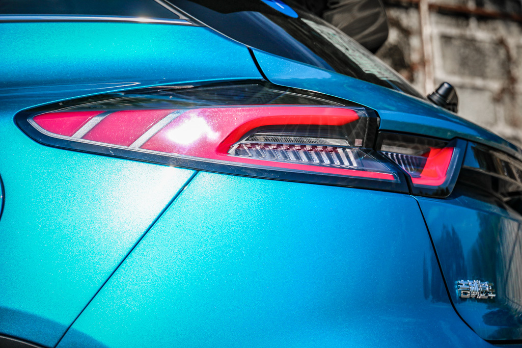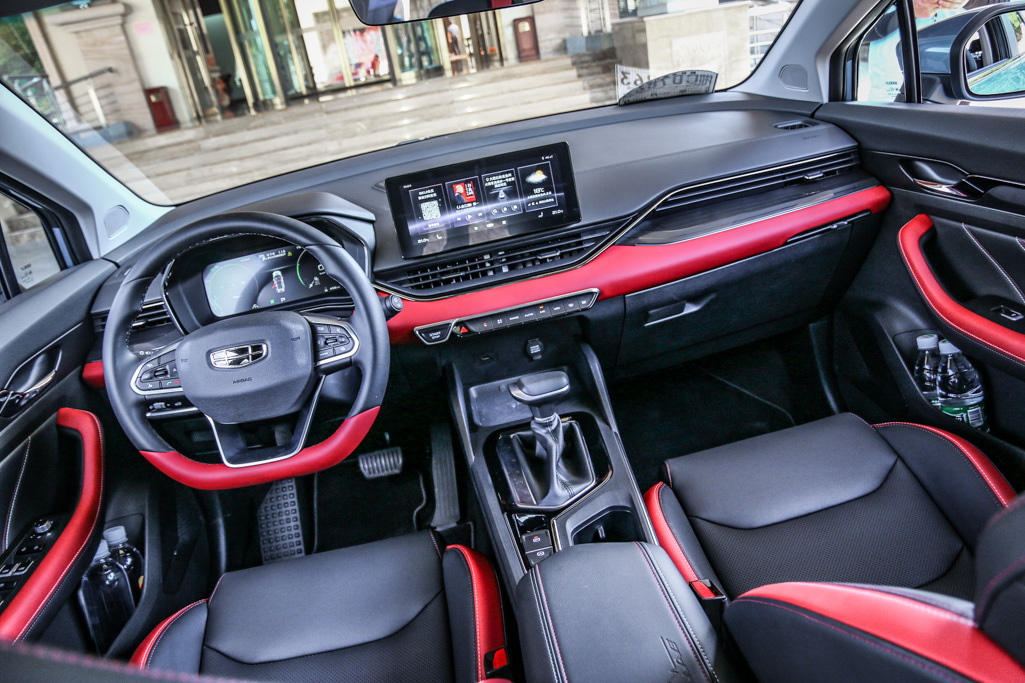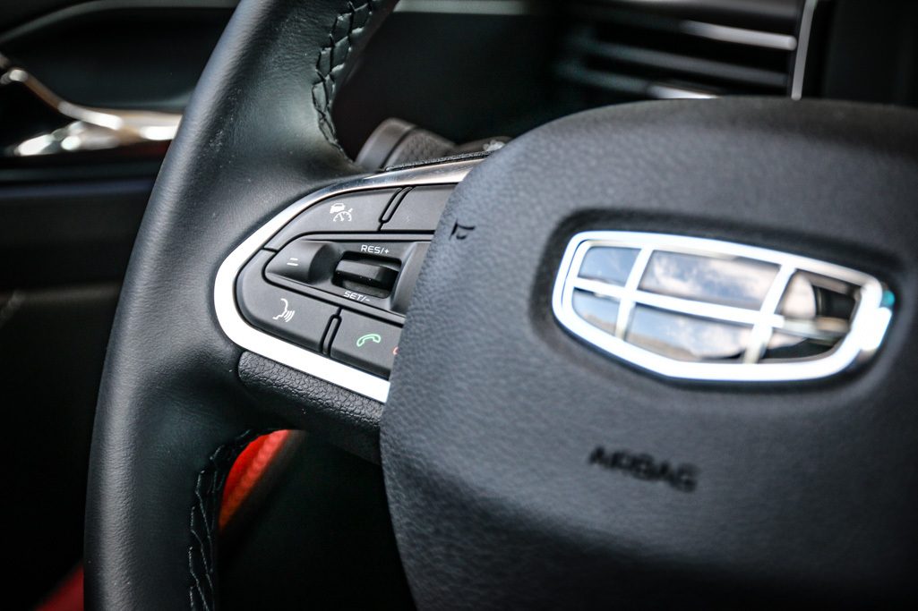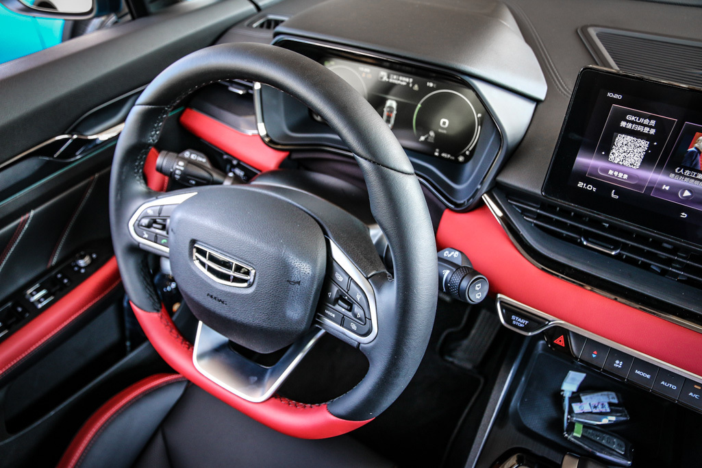 一条配有GEELY Logo的黑色装饰板将两个尾灯连接在一起,让尾部上下层次感分明,而且视觉重心更为高挑。看似双边双出的排气管实则为镀铬装饰件,并没有和排气管相连,这有些遗憾。