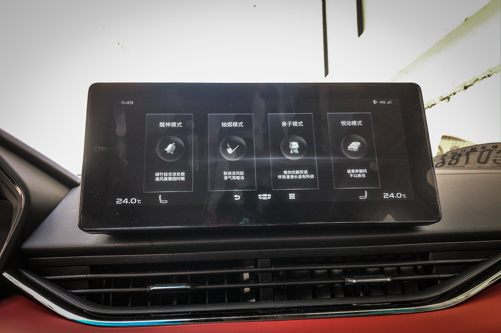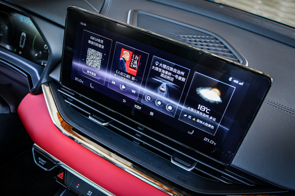 再来看看这个与仪表盘尺寸相同的10.25英寸中控屏,在中控屏上集成了GKUI智能生态系统,操作界面简单直接,操作起来逻辑也很清晰。持手机APP智能远程控制,且终身免费流量OTA远程升级,并且提供了车载WIFI功能。