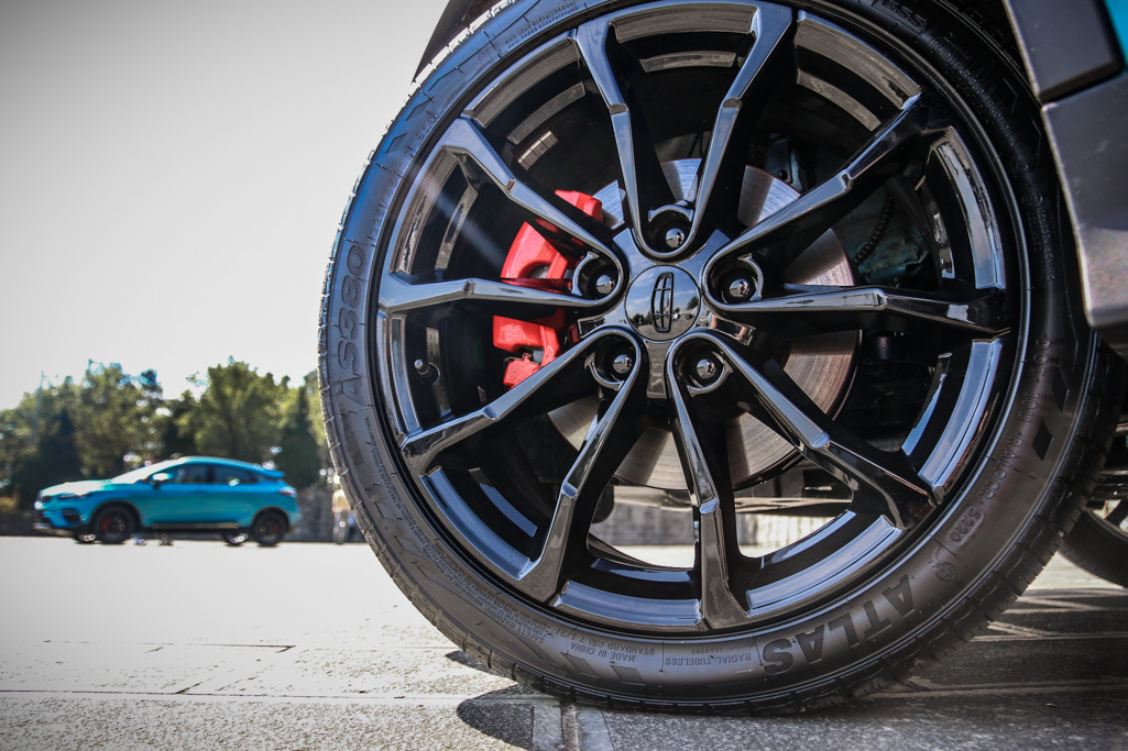 不得不说,这个18英寸五辐式的黑色轮毂加之红色卡钳确实打造出了相当不错的运动效果。加之匹配的ATLAS 225/45 R18这么一款低变宽比的轮胎,让帝豪S表现出相当不错的运动感。