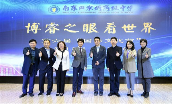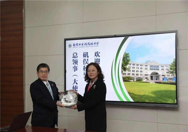 “日中两国年轻一代携手合作共创未来”,2020年11月27日,日本驻上海总领事矶俣秋男专程前来访问南京田家炳高级中学,他在现场欣然题词并做演讲。