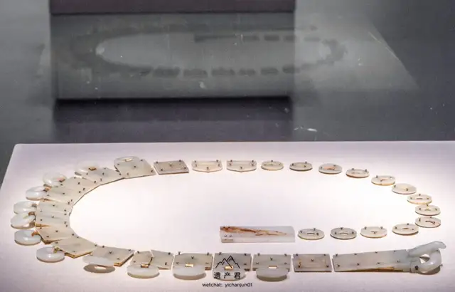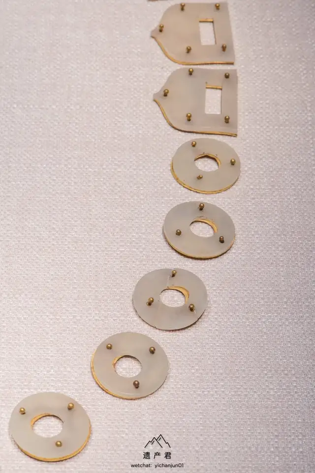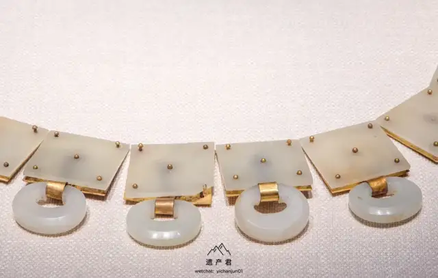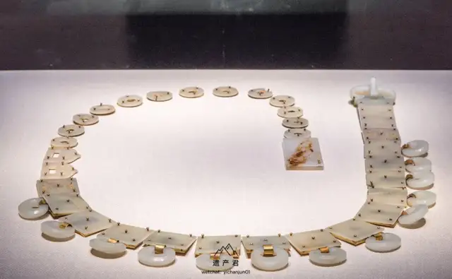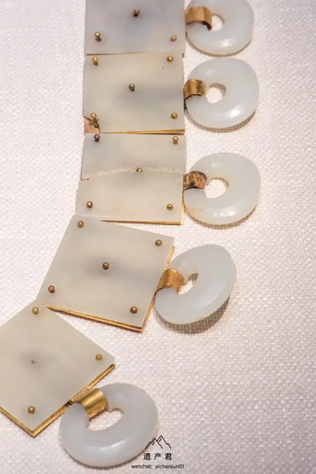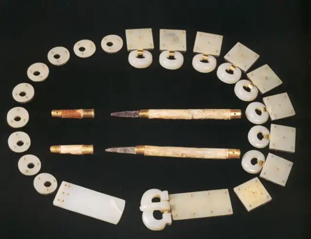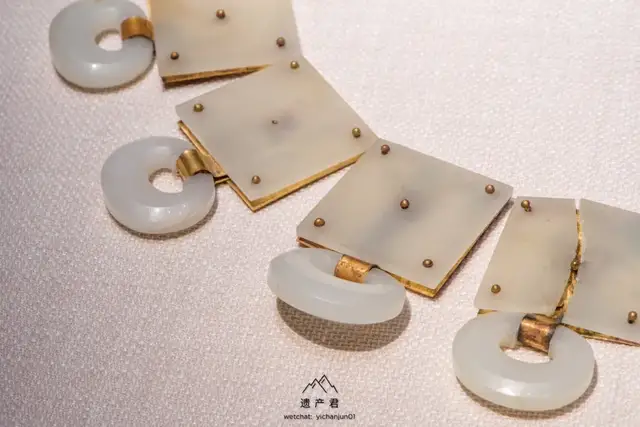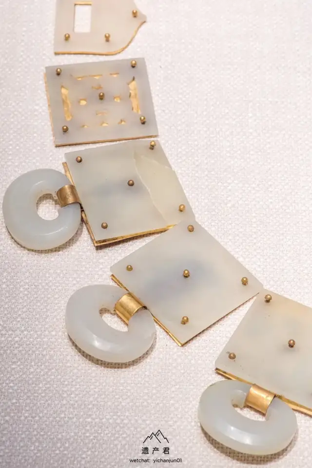 白玉,洁白光亮,玉带原由鞓与钉在其上的带銙,偏心孔环,铊尾和带扣以及鞓后所衬的鎏金铜片组成,另有两件悬挂在带环的带鞘刺锥,玉带具以新疆和田上等白玉雕琢。