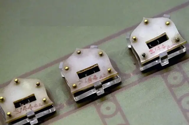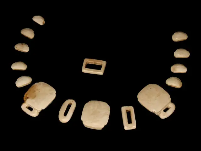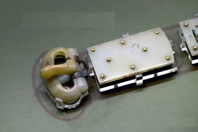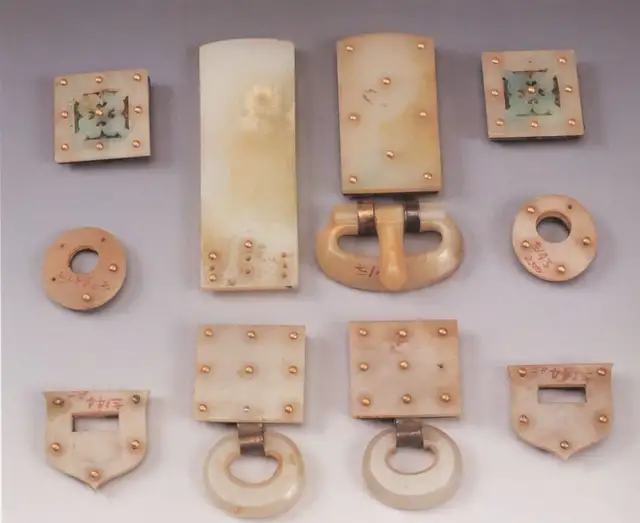 尺寸不一,最大者长4.3cm。通身钙化,为躞蹀带制。由十五块组成,在部分玉带板的下方,有可供悬挂小工具的吊环。