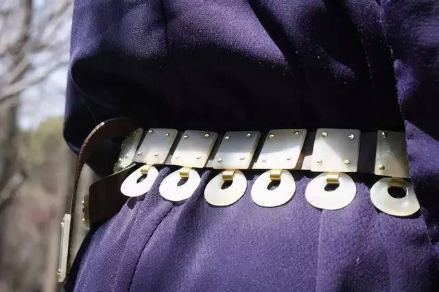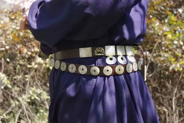 自魏晋时传入中原,到唐代曾一度被定为文武官员必佩之物,带间有带环,用以悬挂算袋、刀子、砺石、契苾真、哕厥、针筒、火石袋等七件物品,俗称”蹀躞七事”。这件十三环蹀躞金玉带,是迄今唯一保存最完整的十三环蹀躞带,是带具中的最高等级。