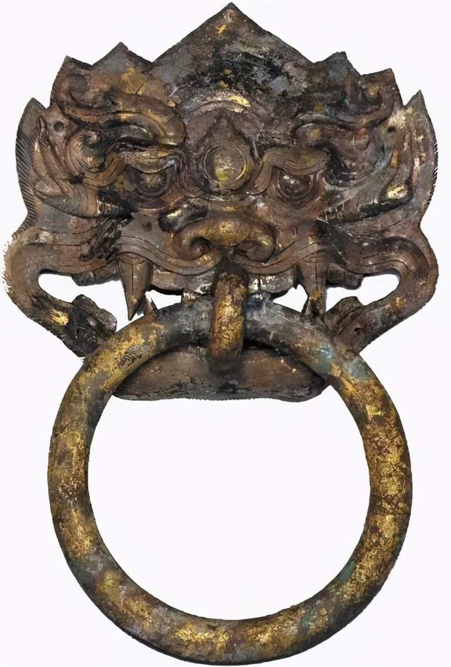 说到这件“鎏金铜铺首”就还得说回隋炀帝之死。隋炀帝最初被草草下葬,不可能有什么像样的随葬品。后来他的旧部将其改葬吴公台下,可能他的旧部也拿不出什么像样的随葬品,于是就从气派的江都宫的宫门上卸下来这4件鎏金铜铺首作为隋炀帝的陪葬品。