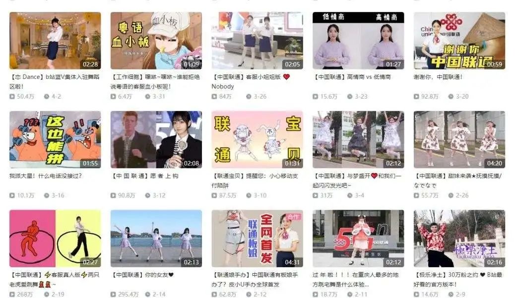 然后就在19年12月,联通官方不知道是受哪位高人指点,突然开窍了。发布了一条B站舞蹈区顶流“新宝岛”的翻跳视频。