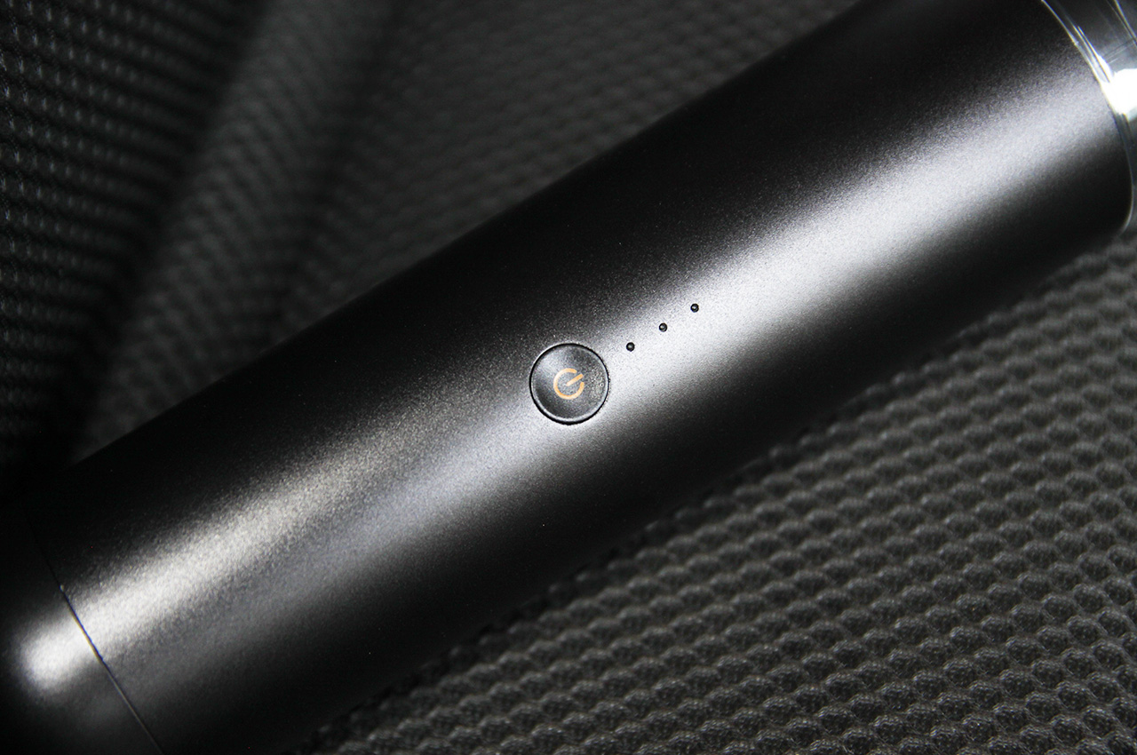 倍思A3有两档风速,按下电源按钮开机即为低速档,再按一下为高速档,按第三下关机,机身还内置空气流量感应元件,灰尘量大还会自动调高吸力。电源按钮旁边有三格蓝色的电量指示灯,开机即可看到电量。