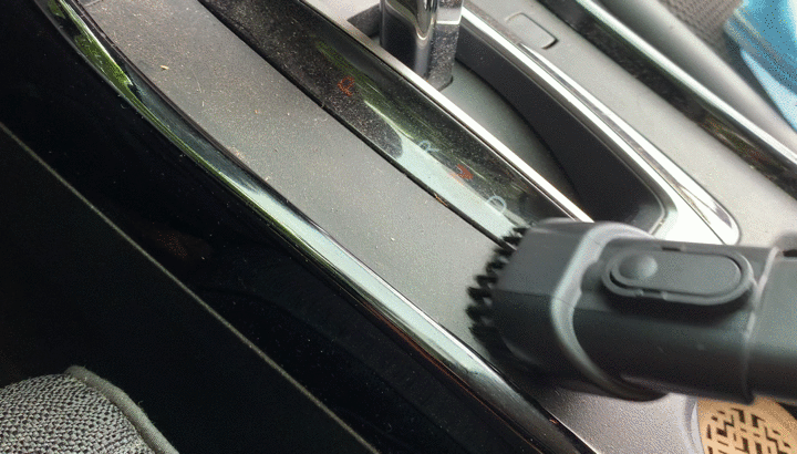 安装好配件就可以干活了,由于喜欢开窗跑,车内灰尘很大。先来吸尘,倍思A3用加长吸嘴配合毛刷,将档位部分吸得很干净。