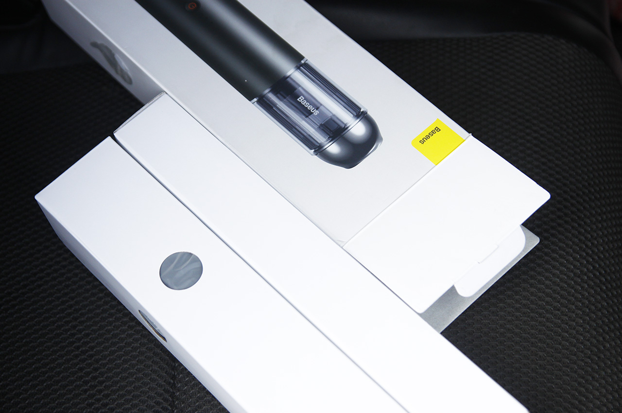 倍思A3车载无线吸尘器包装非常小巧精致,简单开个箱,包装盒里还有两个纸盒,一个装着吸尘器本体,另一个装着配件。
