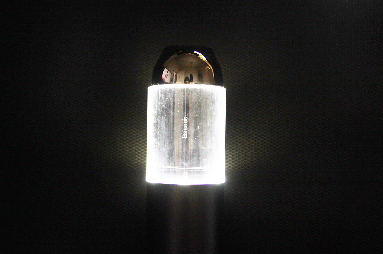 最后,惊喜无处不在,你以为倍思A3头段的透明罩只是装饰,实际上这可是个正八经的灯罩。按住电源按钮两秒钟就能开启照明模式,虽然我不会开灯干活,但出游的时候配个支架用来当营地灯非常不错。